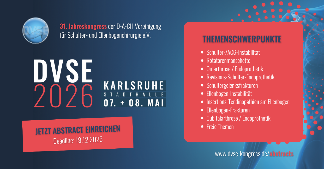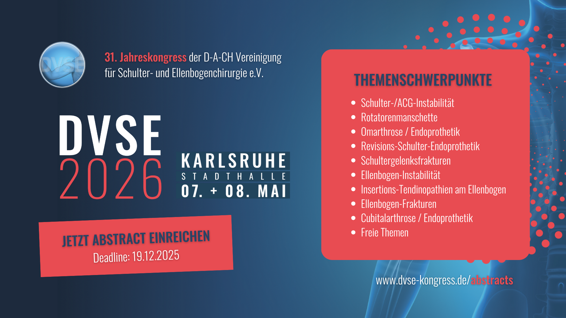 Machen Sie Ihr Netzwerk auf die Abstracteinreichung des 31. Jahreskongress der DVSE aufmerksam und nutzen Sie unsere Grafiken für Ihre sozialen Medien, Fachvorträge und Mails!